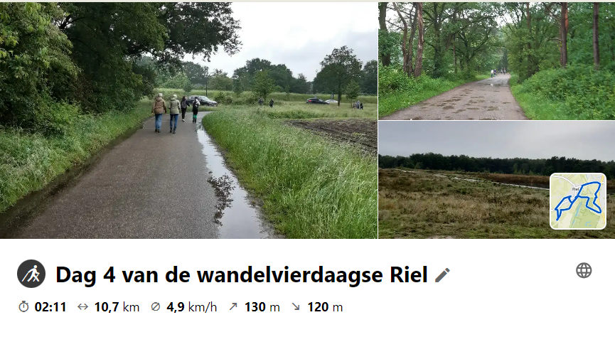 Vandaag de laatste dag van de wandelvierdaagse in Riel. De weergoden waren ons goed gezind wat eigenlijk ook best wel goed uitkwam voor de wandelaars want wandelen in de regen, trouwens dat heeft ook wel wat. Vandaag richting Goirle gelopen en daarna bij het fietstunneltje over de zandweg richting 1ste dijk en daar de hei op en zo weer richting het dorp. Ook nu weer genoten van deze tocht.