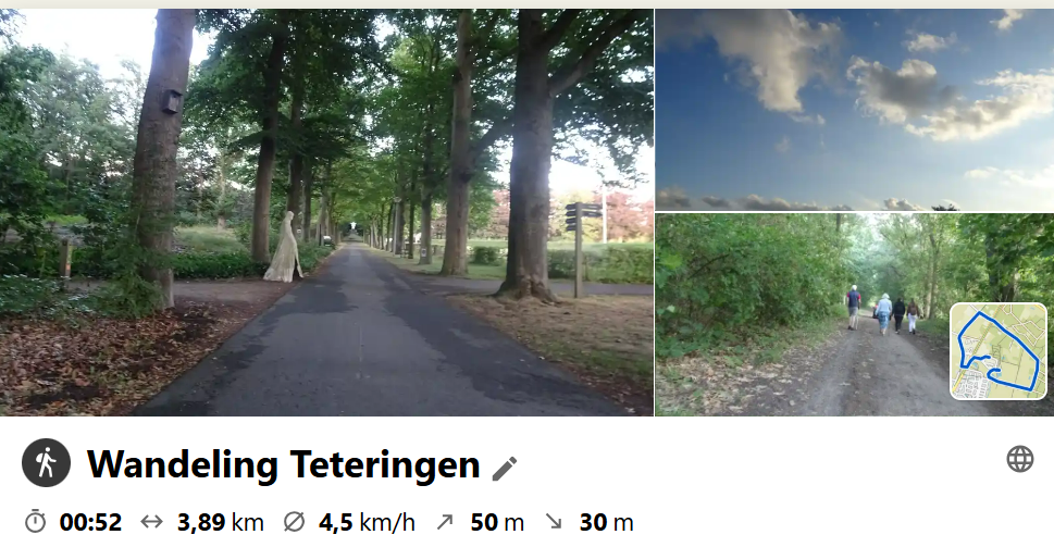 Vandaag voor de afwisseling een avondwandeling gedaan in de omgeving van Teteringen. We waren met 8 wandelaars en het was een aangenaam gezelschap. We vertrokken om 19.00 uur vanaf Arnold Janssenlaan 46 Teteringen en via openbare wegen gingen we weer richting het eindpunt met voornamelijk verharde wegen. De wandeling had de naam "Stilte Slow Walk avondwandeling" Alles aanhorende bleek daar weinig van terecht te komen. maar het was een leuke wandeling en nadien een gezellig na zitje in het restaurant van golfclub De Haenen. Het leuke is dat ik weer wat nieuwe mensen heb leren kennen en ook een avondwandeling met een groep gemaakt, dat was nieuw voor mij. het enige minpuntje: eigenlijk een beetje ver voor 7,5 km wandelen, je zit meer in de auto dan dat je wandelt