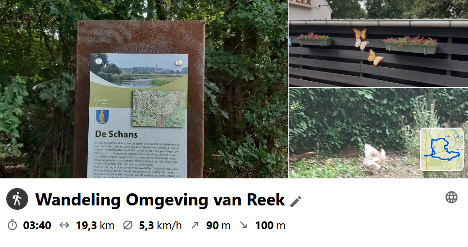 Zaterdag 26 juli 2025.Vanmorgen om 08.45 vertrokken naar Reek voor een wandeling die ik gepland had. De temperatuur was aangenaam goed te noemen en mijn medewandelaars(ters) waren allemaal redelijk op tijd dwz een persoon had gemeld dat ze een beetje later zou arriveren en dat was ook zo. De geplande vertrektijd van 10.00 uur werd dus 10.05 uur. Een kniesoor die daar over valt! met frisse moed en veel enthousiasme vertrekken we met 6 personen, 2 dames en 4 heren, richting voor de meeste het onbekende, en dat maakt het zo leuk! Na ongeveer 9 km gelopen te hebben we in de thee tuin even een rustpauze genomen en genoten van een heerlijke kop koffie en sommige van ons hadden lekkere honger en die namen er een stukje gebak bij wat ongetwijfeld heerlijk gesmaakt zal hebben. na een klein uurtje verplichte rust ,omdat de eigenaars het niet bij konden benen, zijn we weer verder gewandeld. met nog ongeveer 8 km voor de boeg en een paar keer de verkeerde afslag genomen te hebben komen we tenslotte op de plaats van bestemming maar niet voordat we de plaatselijke horeca nog gesponseerd hebben. Een speciaal woord van dank aan Leo onze gids die veel over de omgeving wist te vertellen. Wil je deze route ook een keertje lopen, klik dan hier