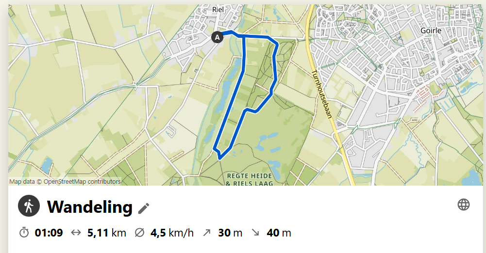 Vanmiddag een klein rondje(5km) gelopen door het Riels Laag. Ik meende dat ik even eruit moest. nog maar net op pad toen ik mijn buurvrouw tegen kwam met haar hond. Even een praatje met haar gemaakt(10 minuten denk ik) en daarna weer mijn weg vervolgd. Niet veel bijzondere momenten maar het belangrijkste is dat ik weer 1 uurtje gelopen heb