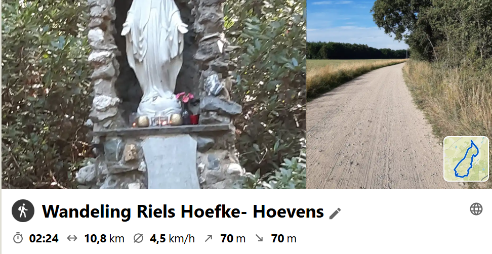 Vandaag een avondwandeling georganiseerd door het Riels Hoefke en over de Hoevens. We zijn niet over de natuurbegraafplaats gelopen wan Marielle vond dat wat eng en dus rechtdoor gelopen en daarna linksaf de Goorstraat ingelopen. Na een paar 100 meter een bruggetje over . Planken die over een sloot liggen. Even later lopen we over een ijzeren brug waar de sloot helemaal van droog stond, zonde maar de bomen en struiken zagen er perfect uit!! Dus dat was dan weer een dikke plus. Een stukje verder door gelopen en daarna het toilet gebouw van Natuurcamping De Hoevens even aangedaan en de dames dankbaar gebruik van gemaakt. Na de sanitaire stop, wat er overigens keurig uitzag, weer verder gewandeld richting Het Ooievaarsnest om daarna over de houten brug en wat slingerpaden weer op het Riels Hoefke uit te komen. En zo zijn we na iets meer dan 2 uur wandelen weer aangekomen bij ons vertrekpunt waar mijn gastwandelaars hun auto hadden geparkeerd. Conclusie: Leuke wandelroute met zeer aangenaam gezelschap.