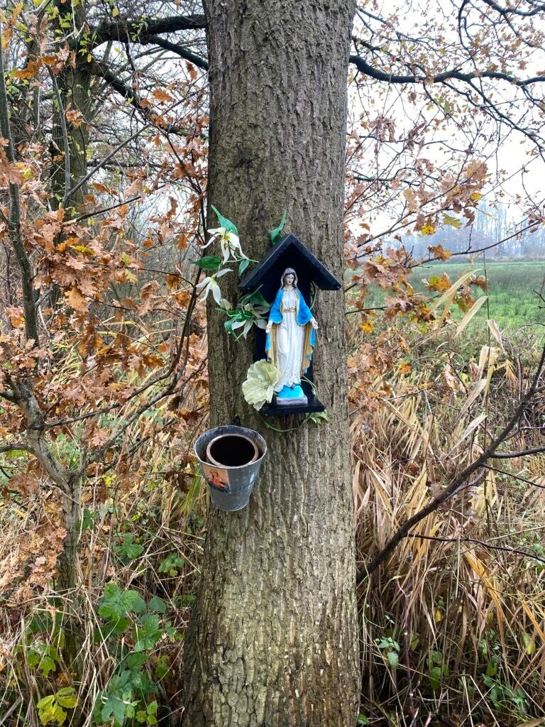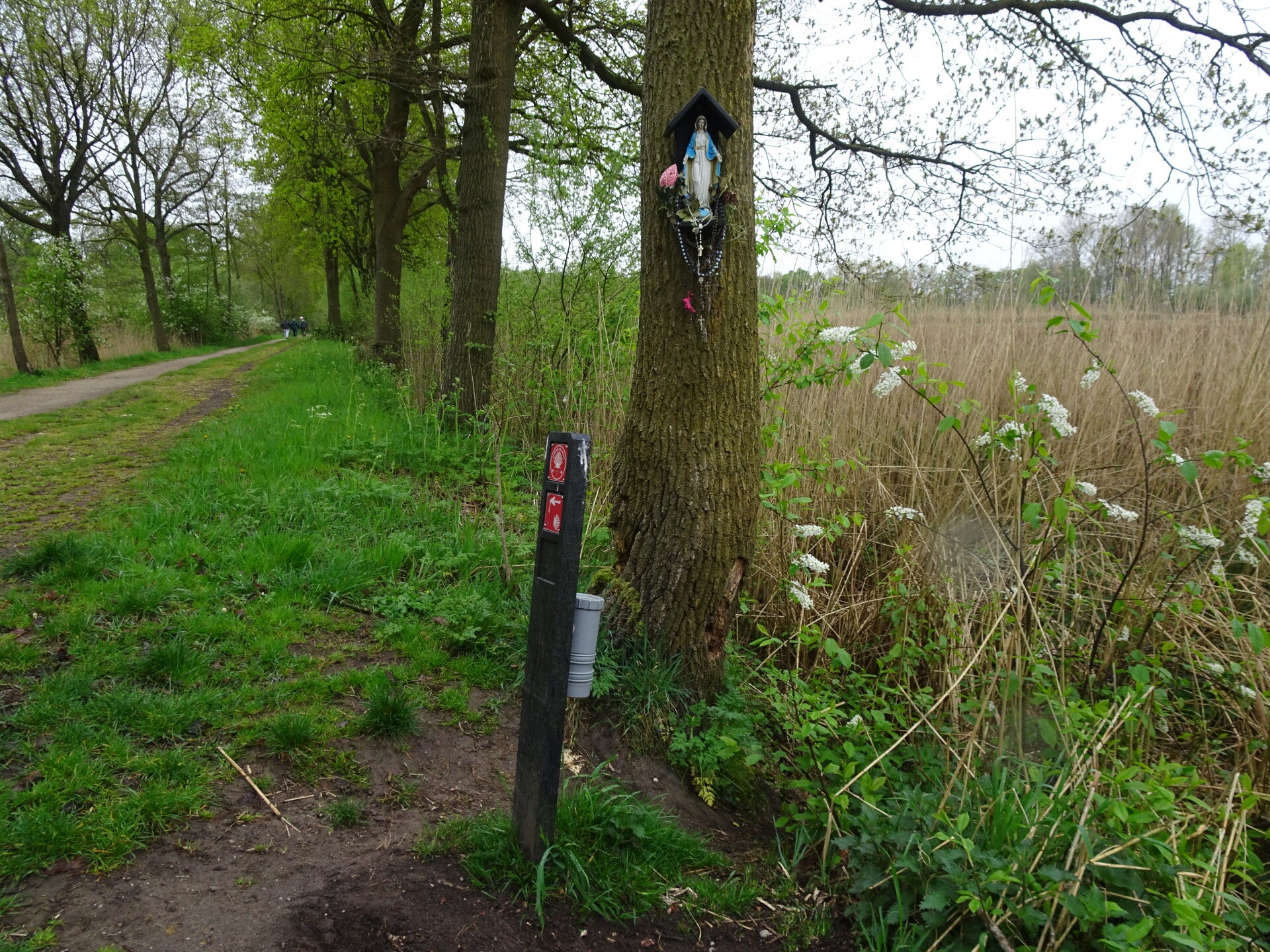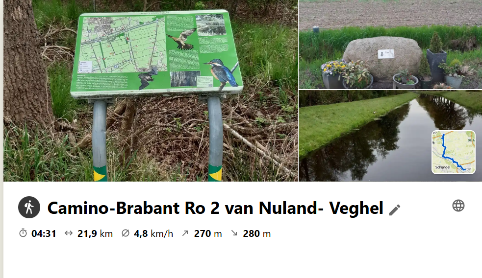 vandaag in alle vroegte vertrokken voor mijn 2de route Camino-Brabant. Deze route liep van Nuland naar Veghel. Een mooie route, voor mijn gevoel iets te veel verharde wegen in het parkoers maar kleinigheidjes blijf je houden. Ik heb het trek pontonnetje gemist en dat is wel jammer, had graag willen ervaren hoe dat was maar verder voor ieder wat wils. ik ben een Pelgrim tegen gekomen. ik kwam in Heeswijk net uit de Kerk en kwam haar op het kerkplein tegen. Als lotgenoten maak je dan even een praatje om daarna ieder zijn/haar eigen route weer te volgen. Ik kwam schotse hooglanders tegen, honden die me enthousiast begroeten maar wel achter een groot hek stonden te blaffen. Een klein eindje verder een hele grote gedenksteen van een jongen van 12 of 13 jaar die daar waarschijnlijk verongelukt is. Ik heb behoorlijk wat regen moeten trotseren maar ook dat is zeer de moeite waard. En de Camino App getest natuurlijk. hij doet het fantastisch!!